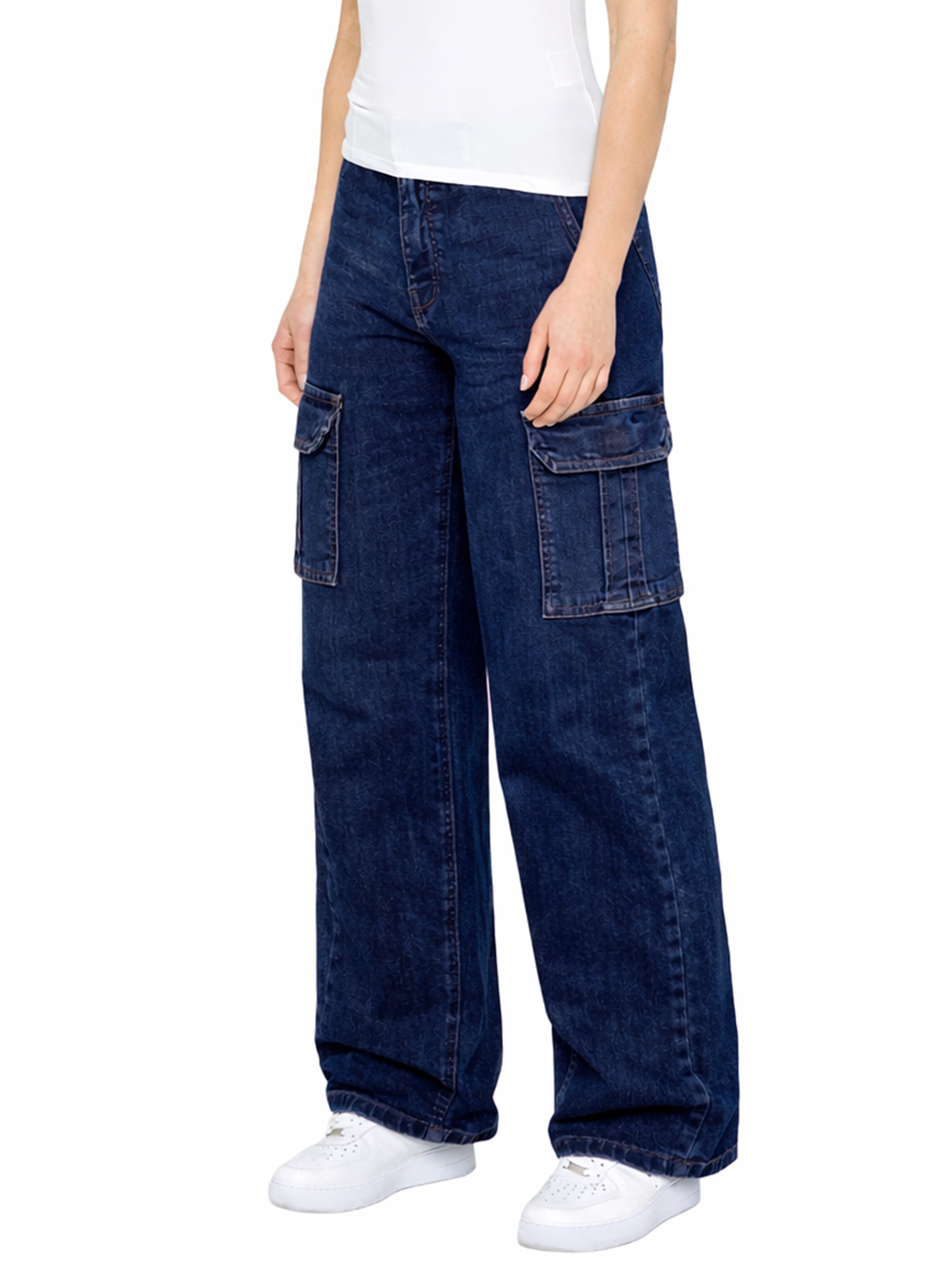 - Women's cargo pants wide leg baggy jeans in dark blue.