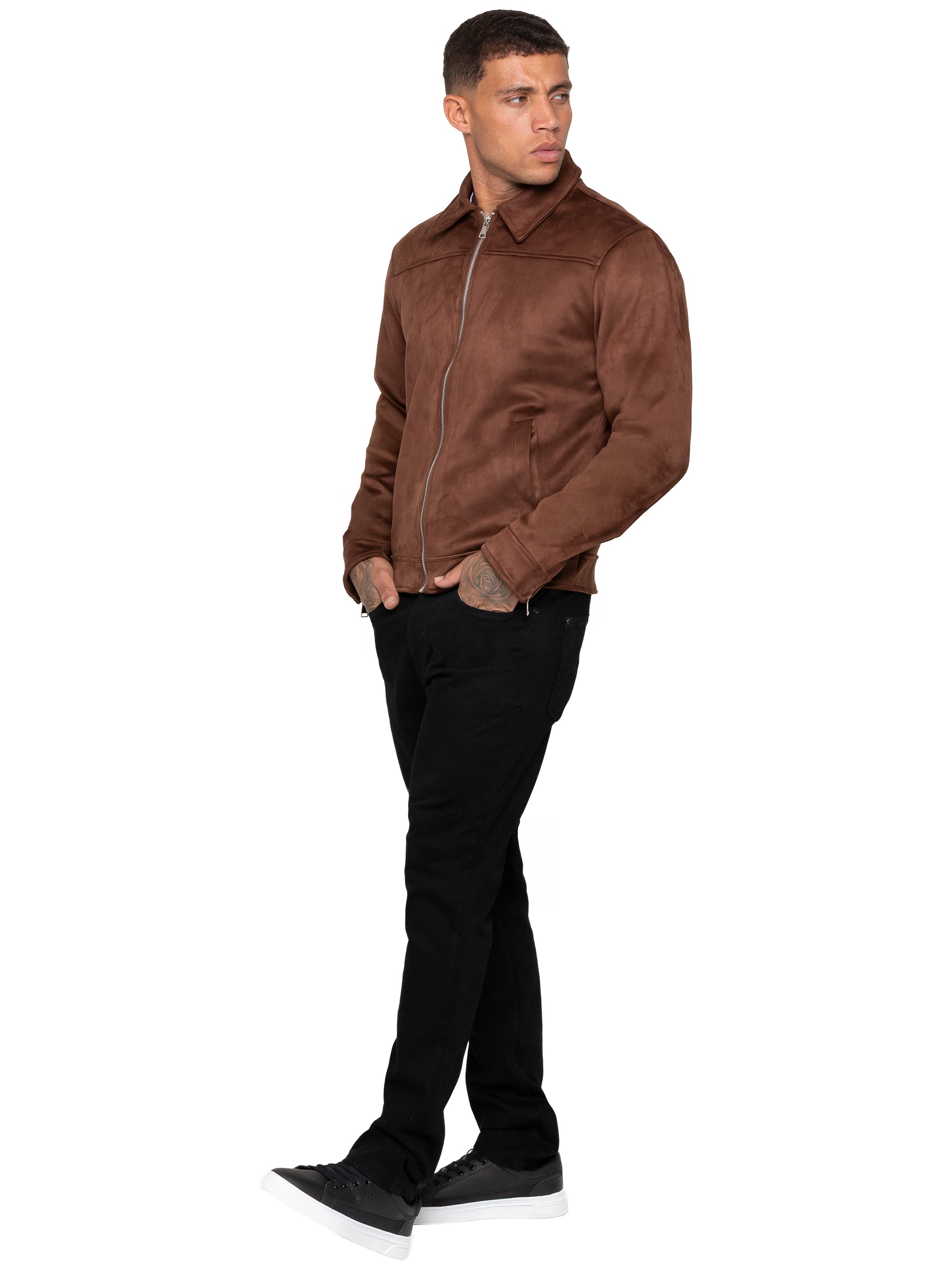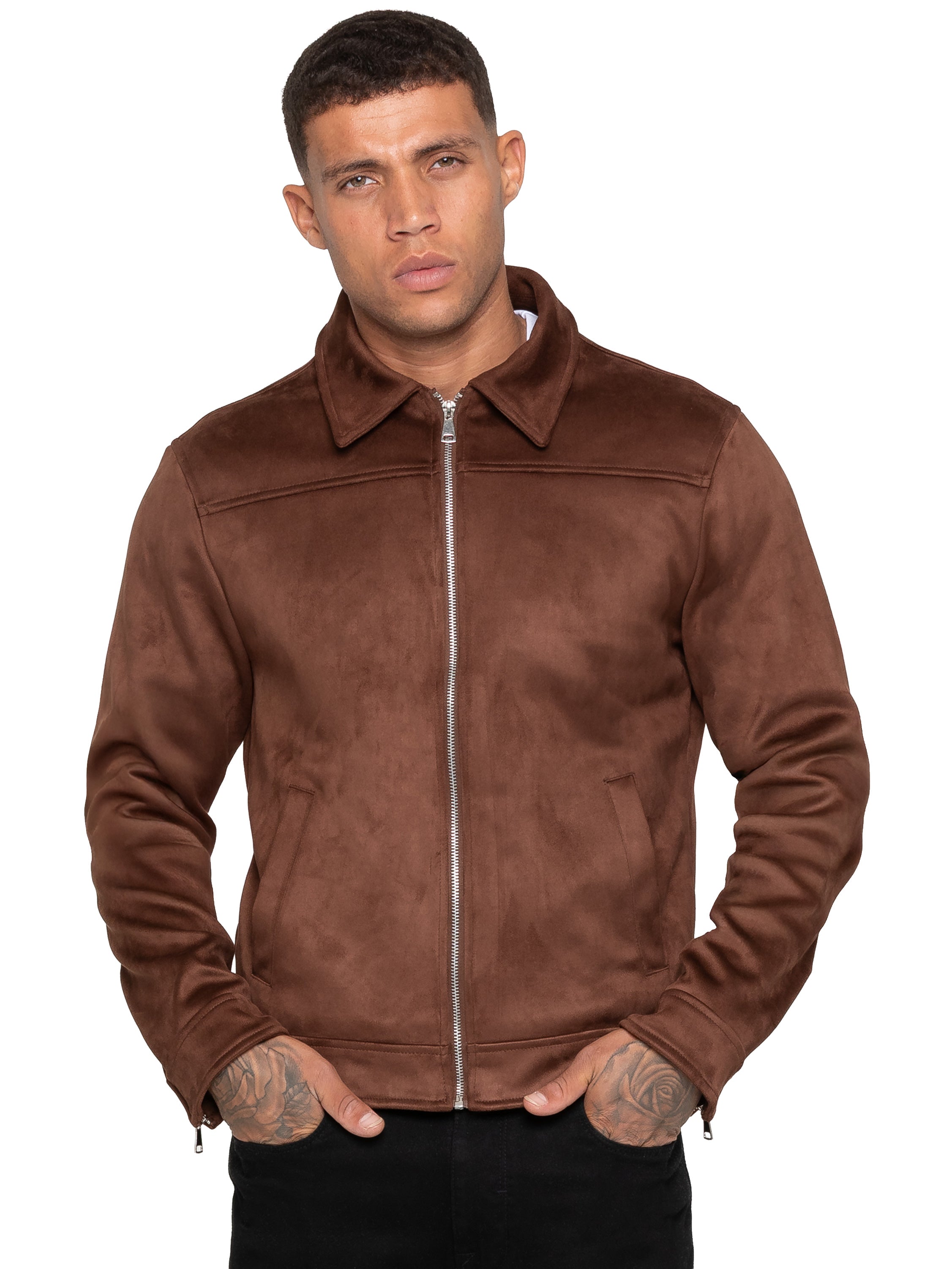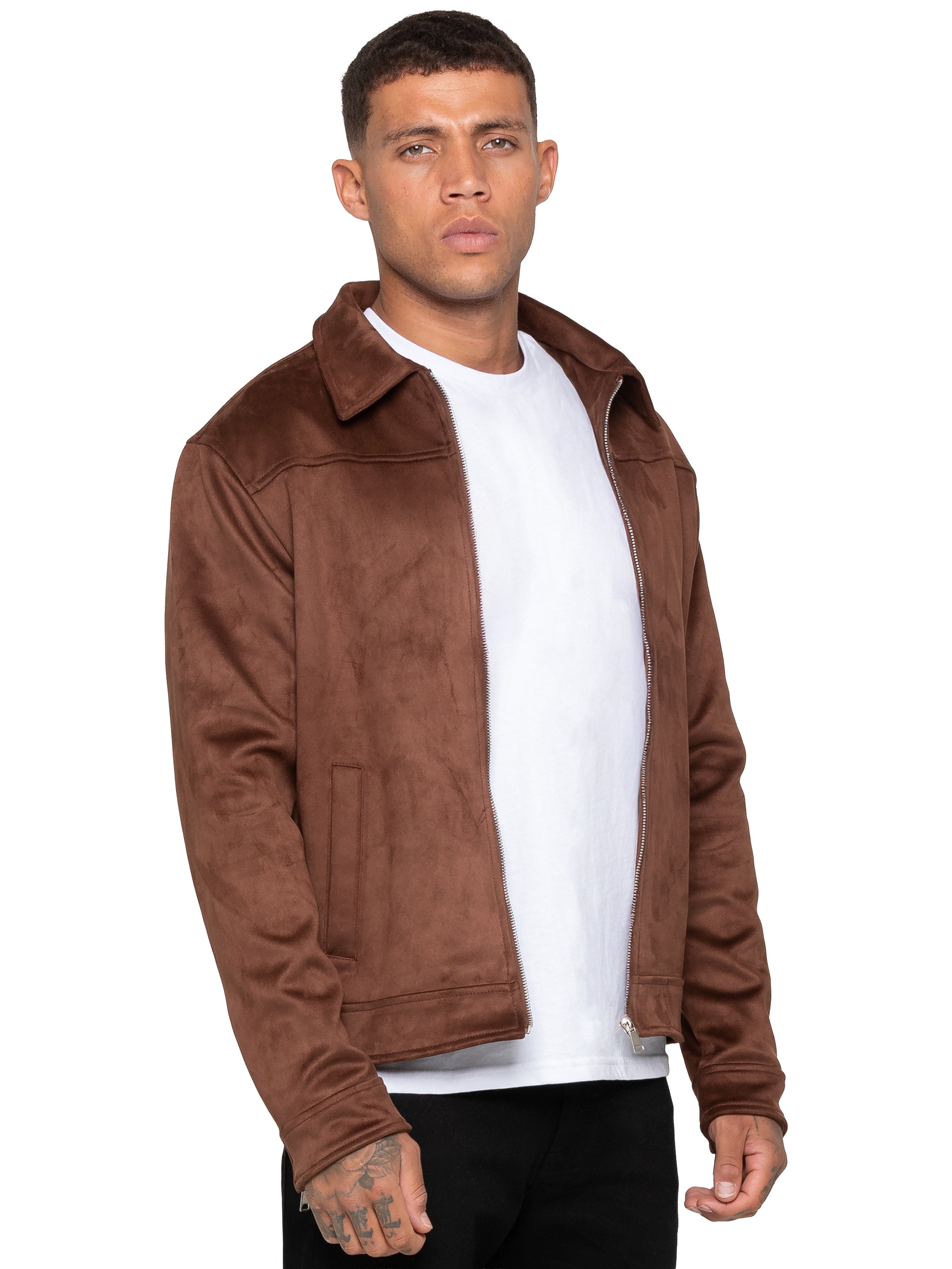 - Men's brown faux suede jacket.