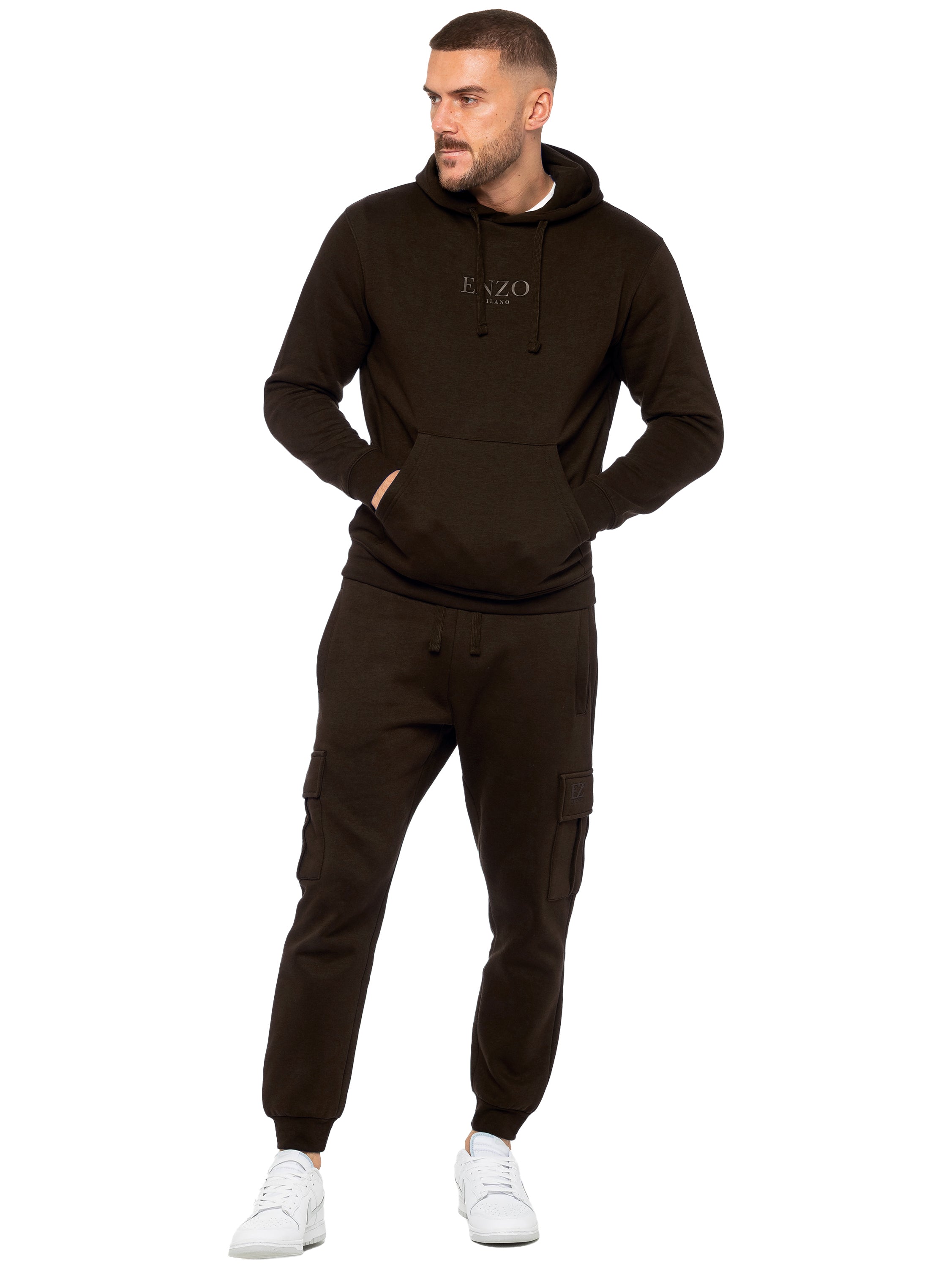 - Pullover brown sweatshirt with hood and cargo joggers set.